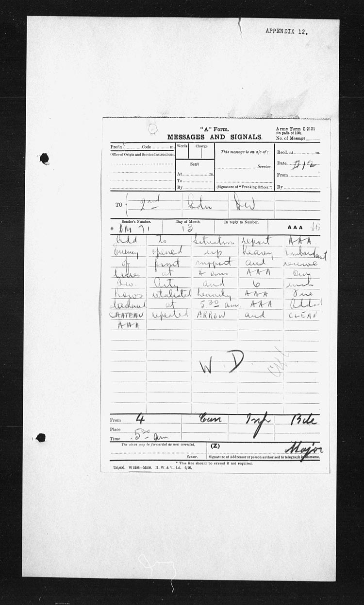 “Add to situation report. Enemy opened up heavy bombardment of front support and reserve lines at 4 am. Our Div. [divisional] Arty [artillery] and 6 inch hows [howitzers] retaliated heavily. Fire slackened at 530 am. Added CHATEAU repeated ARROW and CLEAN.[x]”