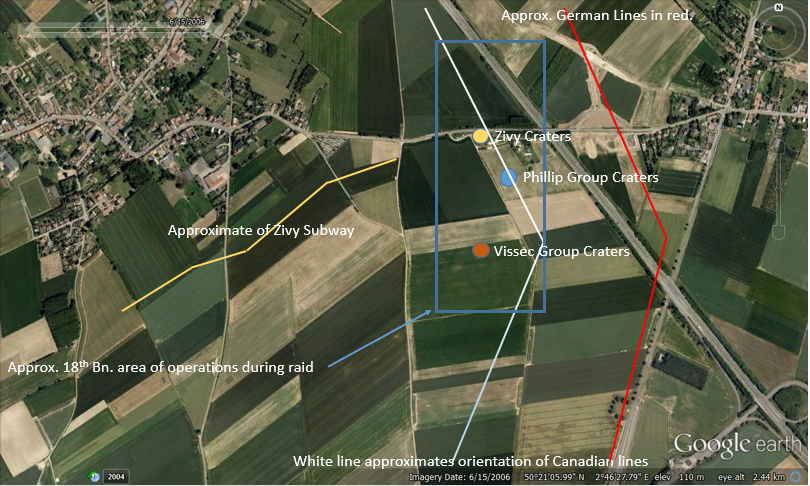 On March 13, 1917 the 18th Battalion was in the line near the Zivy, Phillip and Vissec Craters. The local is approximately bounded by triangular sector with Nueville-Saint-Vaast to the west, approximately adjacent on the north to road D49, to the west Auto Route Des Anglais, and to the south approximately 500 metres. The red line in the map below gives an approximation of the location in reference to the geography in the area. Therefore, the left flank of the battalion was demarcated by Zivy Craters, the Phillip Group of craters was the center of their line; and the Vissec group was the right flank.