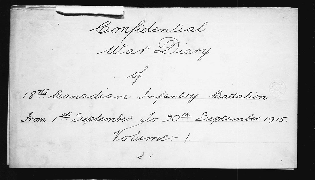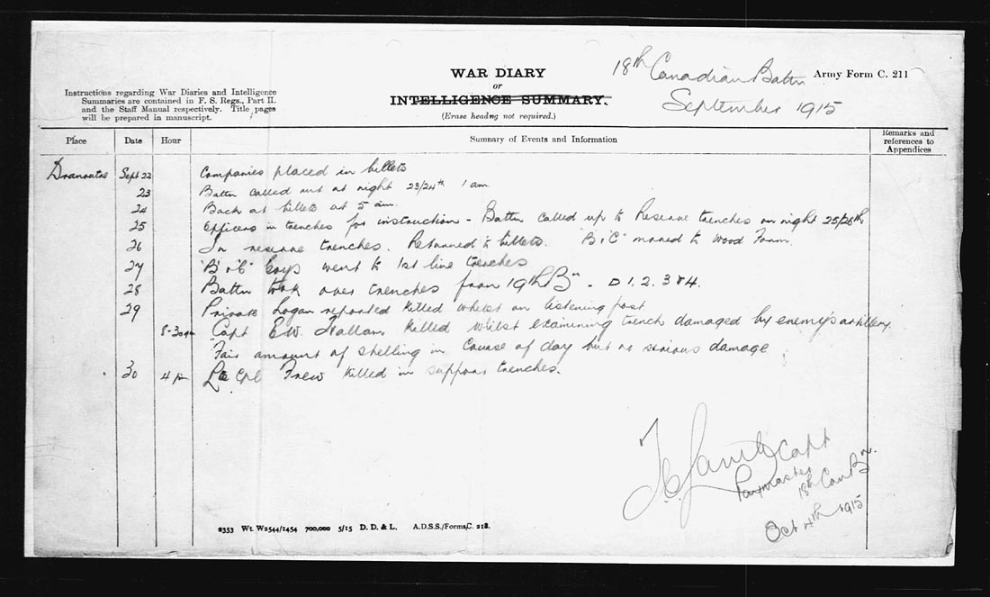 Note: the war diaries for this month available online are in two parts. One part is the battalion diary kept by the Paymaster with the rank of Captain. As of the date of this entry his name is unknown as his signature is illegible on the form. The second diary to be posted later is of the Medical Officer, Captain G.C. Hale.