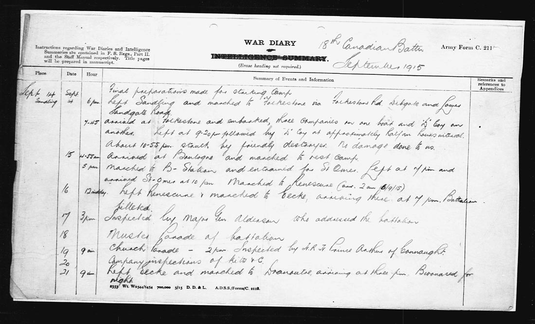 | 15 | 4.55 am 5 pm | Arrived Boulogne and marched to rest camp. Marched to B-Station and entrained to St. Omer. Left at 7 pm and arrived St. Omer at 10 pm. Marched to Renescune (and 2 am 16/9/15) | |