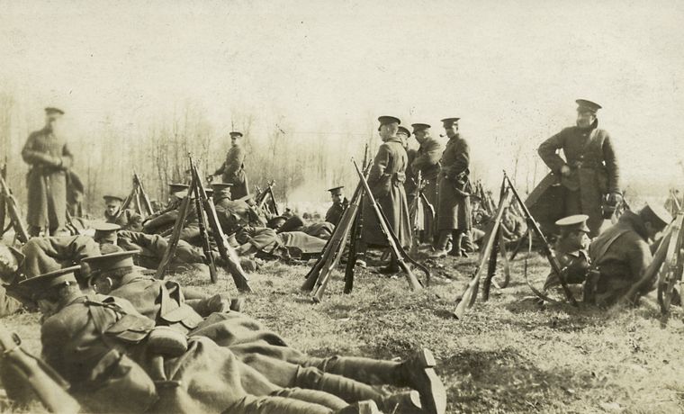 Possible Clues: 1.) Rifles. Detail hard to determine if Ross Rifle but from the shape of the stock would say is the Ross Rifle which was used by C.E.F. 1914 – 1916. 2.) Uniforms.