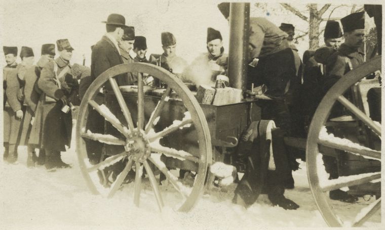 Possible Clues: 1.) Field kitchen equipment may be peculiar to Canadian Army at this time (1915). 2.) Uniforms.