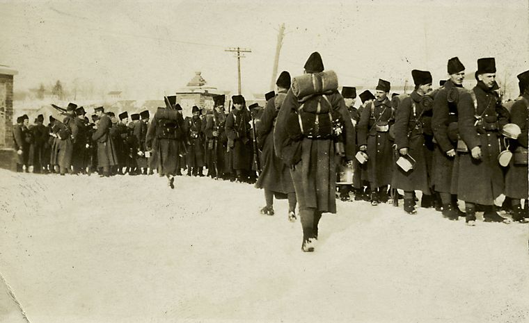 Possible Clues: 1.) Rifles. Detail hard to determine if Ross Rifle but from the shape of the stock would say is the Ross Rifle which was used by C.E.F. 1914 – 1916. 2.) Uniforms. 3.) House architecture reflective of Canadian homes. 4.) Power poles. 5.) Fire hydrant (note lack of snow on ground).