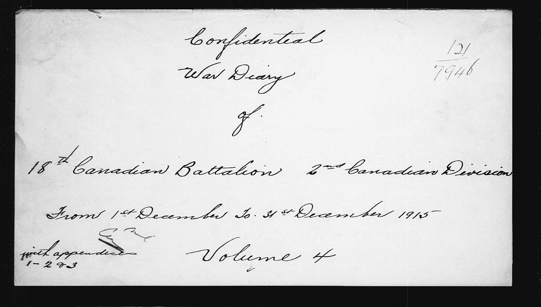 | 26 | “B”-“D” Coys relieved “A”-“C” Coys in trenches – wishes for Xmas and the new Year were received from H.M. the King, H.R.H. The DUKE OF CONNAUGHT and Major General SAM HUGHES – Pte Newlands _ Pte C. McCarthy [E. Carthy] killed in action [Note: confirmed names and details CWGC web site] – 3 – O.R. admitted to hospital. | ||
