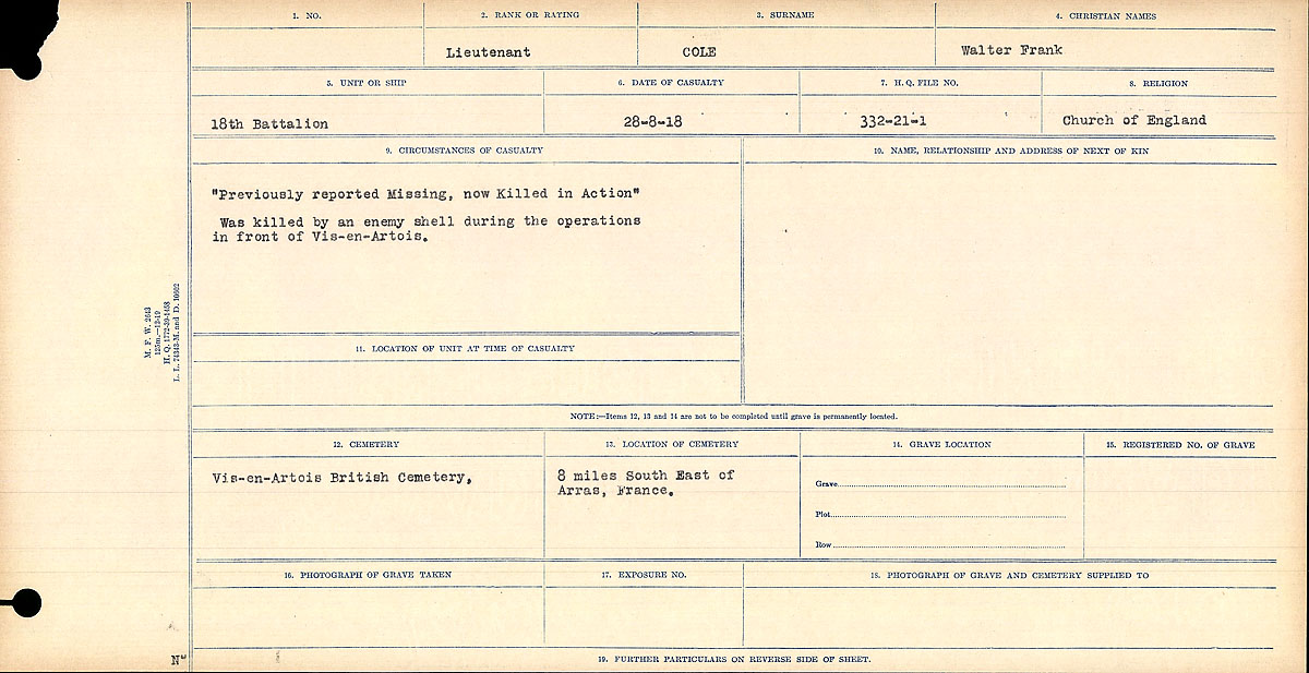 As gave be seen both were killed on the same day. Private Cole was killed on operations in the Vis-en-Artois area and died instantly from shrapnel wounds to his legs and body. Lieutenant Cole was originally reported missing but was reportedly killed by a shell in the same area of operations.