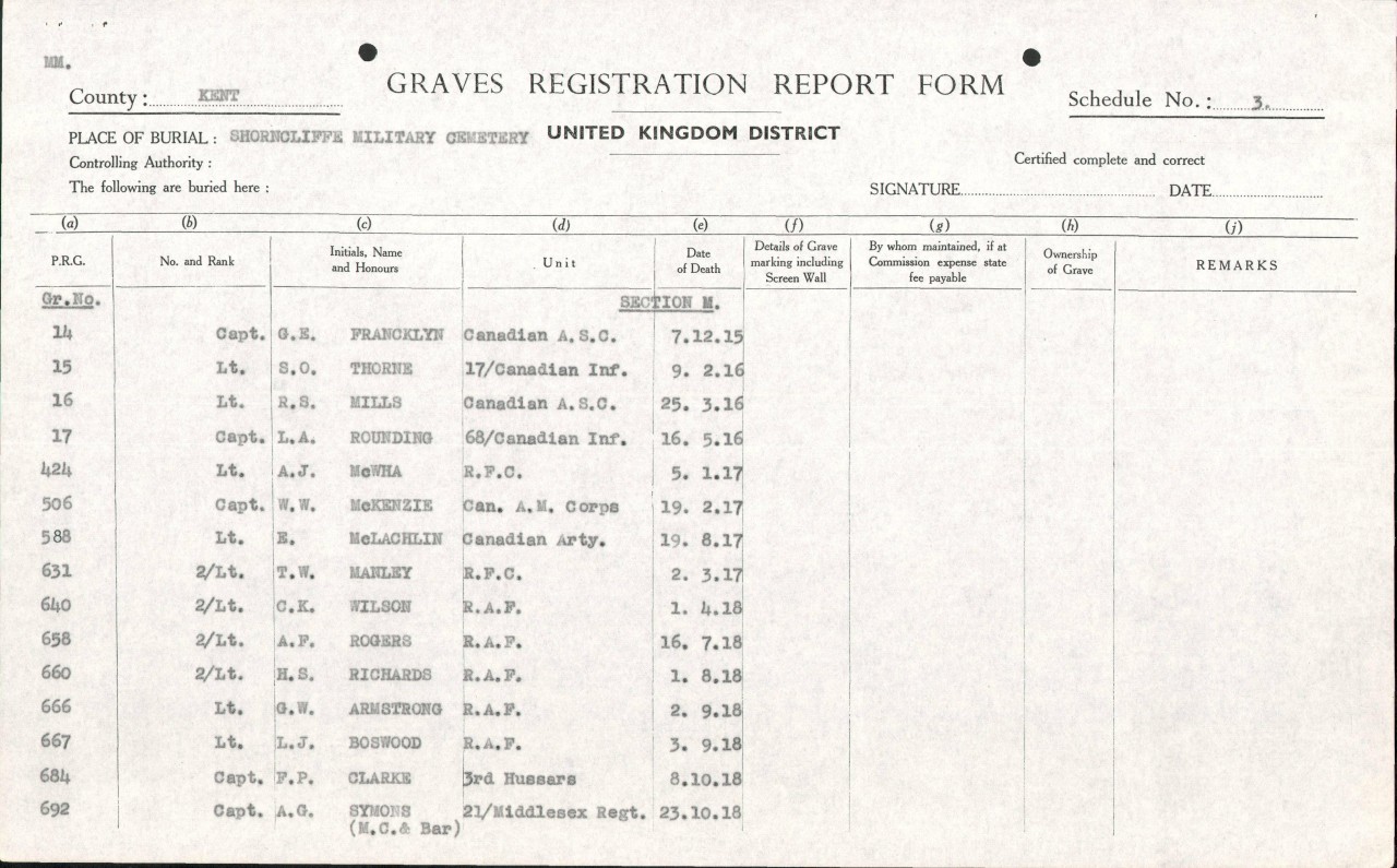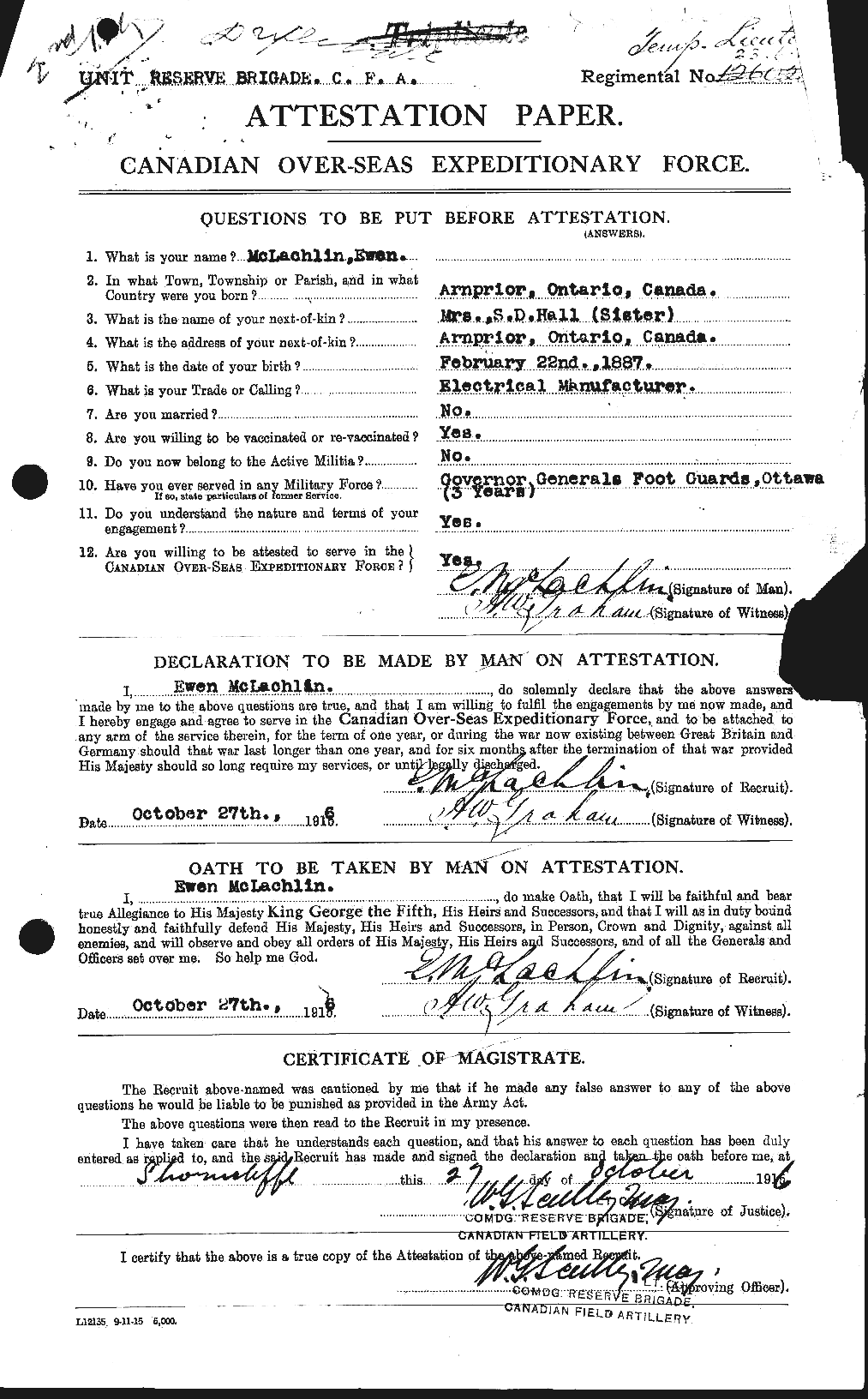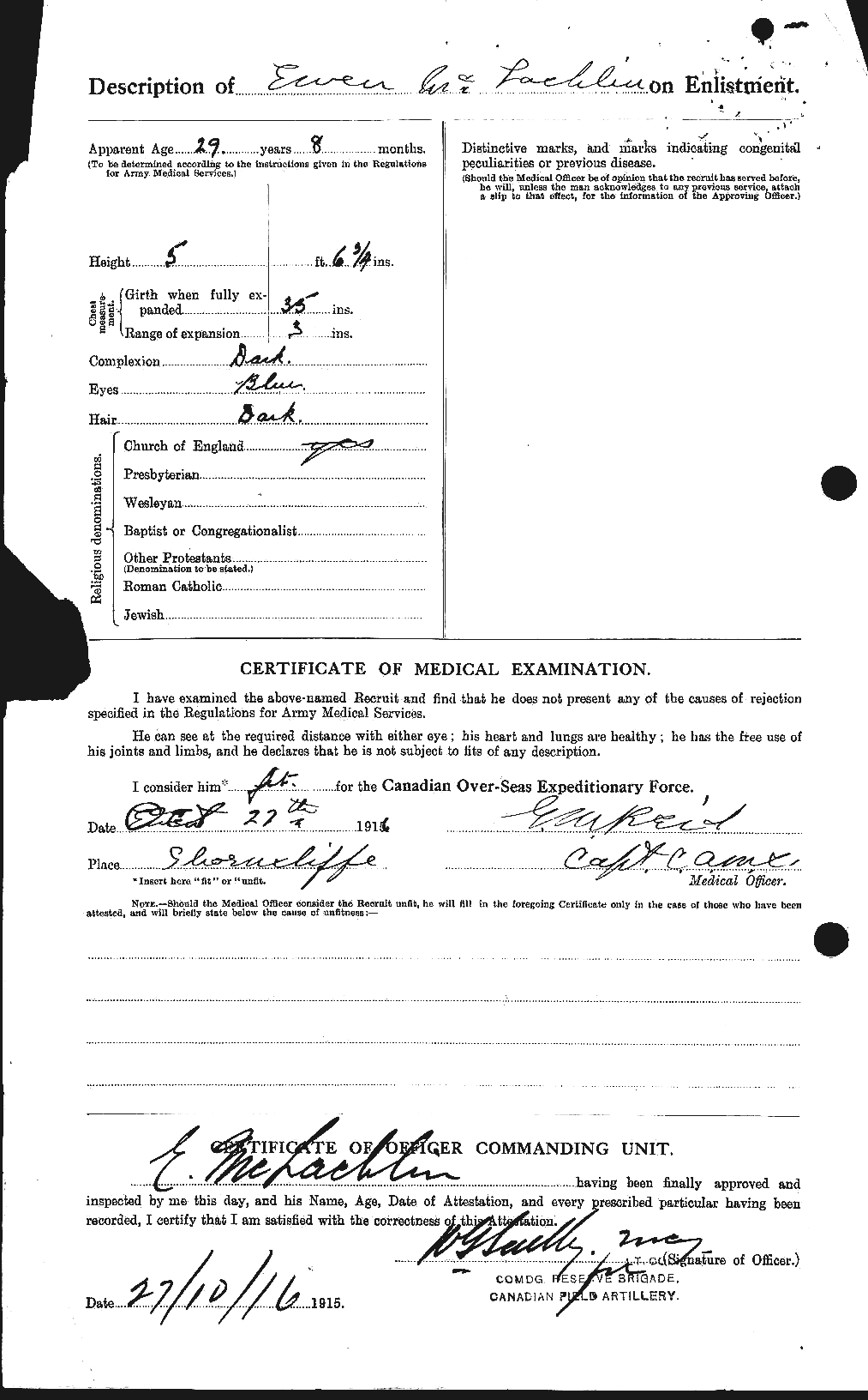 | Lt. Ewen McLachlin | Attested October 27, 1916 in Shornecliffe, Kent, England |