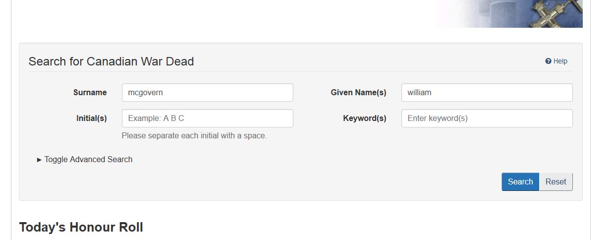 Note: Often by simply doing a Google search for the soldier’s name will garner a hit from both the CVWM and the Canadian Great War Project (CGWP) site. The problem with common names is that there could be multiple incorrect hits so defining the search parameters to Canadian sites only facilitates finding the soldier you are researching for. If the soldier has a middle name and you have the correct rank the likelihood of a good search hit is very high.