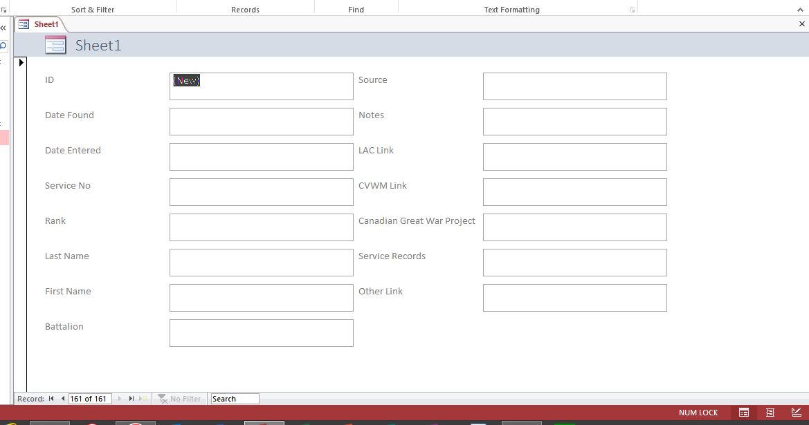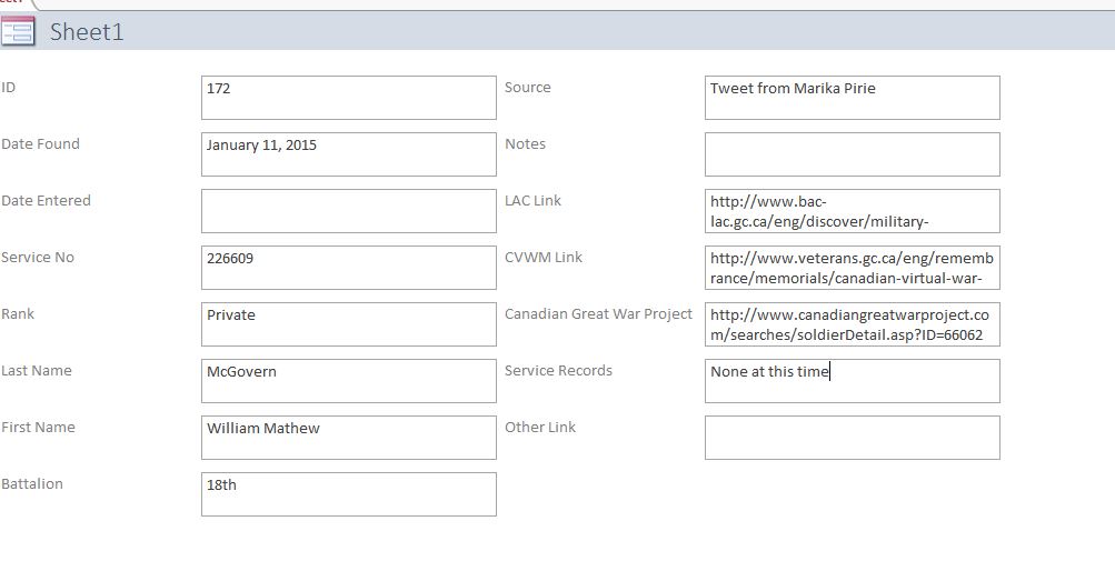 At this time this data is entered in the database as completely as possible. In the database the Library and Archives link, the Canadian Virtual War Memorial link, and the Canadian Great War Project Page. Note that I do not use the Commonwealth War Graves Commission site initially as the database covers all Commonwealth soldiers and the CVWM site offers, in some cases, images that can facilitate research. The CWGC site comes into play later.