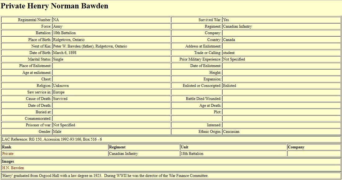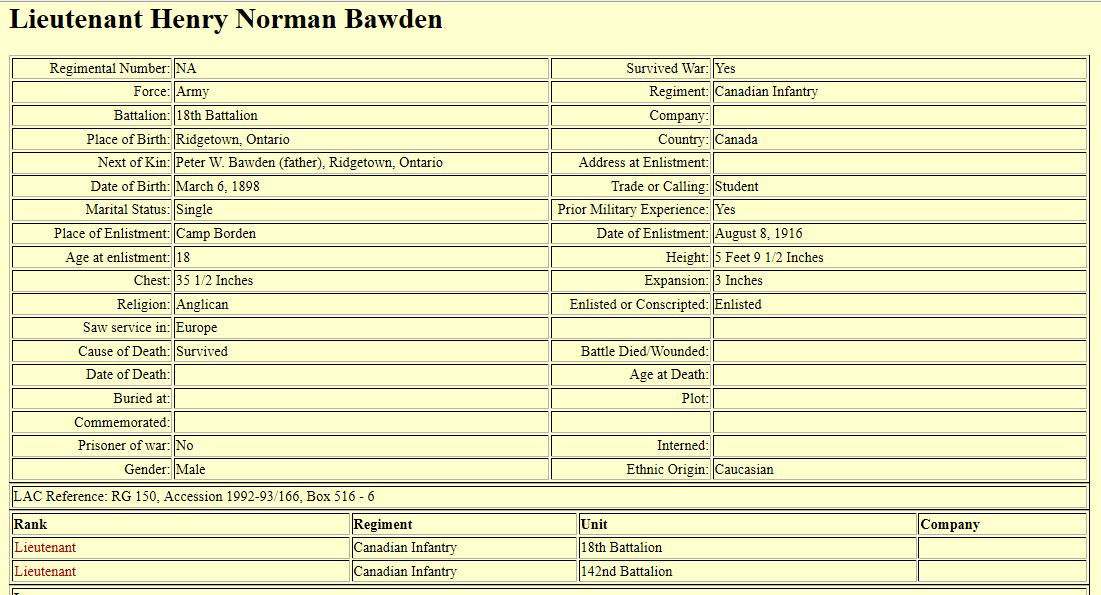 “Private” Henry Norman Bawden’s information page at the CGWP site. Of interest is the given rank of Private when there is almost a certainty that he was Lieutenant in the 18th Battalion.