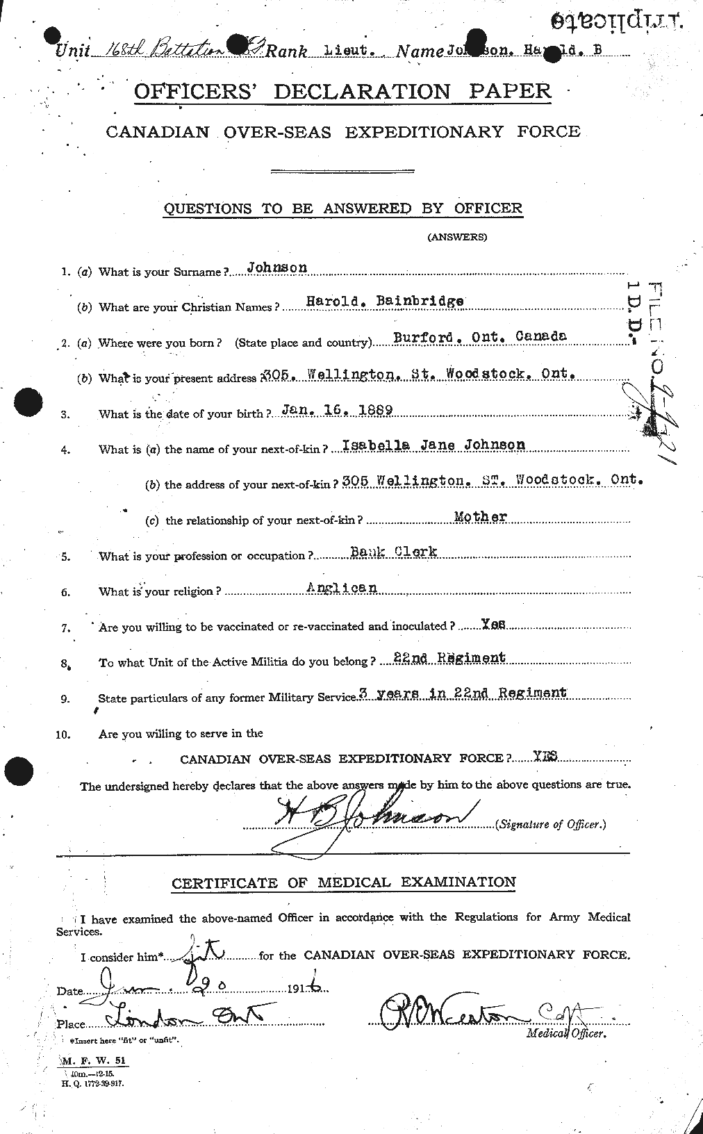 Sample Officer’s Declaration Paper. Note the lack of a regimental number.Early style attestation paper. Note the regimental number has been struck out. Many samples simply have no number or notation of rank.
