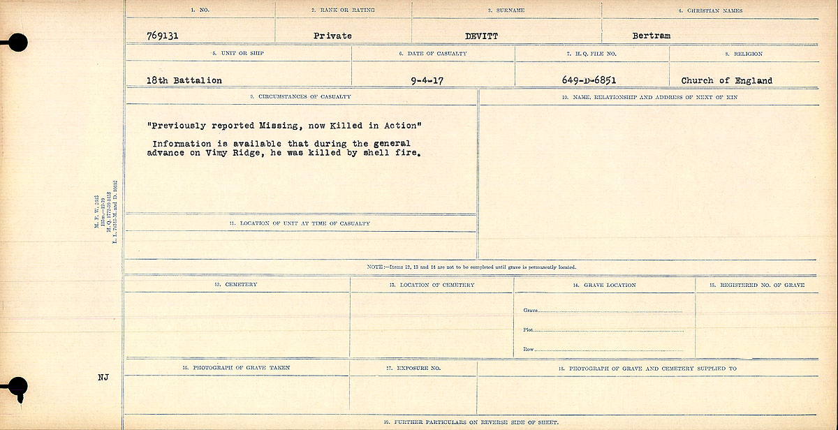 If you query the Commonwealth War Grave Commission site by using this date you find that on this date there are 2,374 records of Canadian soldiers dying on this date. Not all of them were involved at Vimy as some of this number where wounded days, weeks, even months previously and died on this day (died of wounds) but it gives you an idea of the cost. Of that number 37 men of the 18th died on that day.