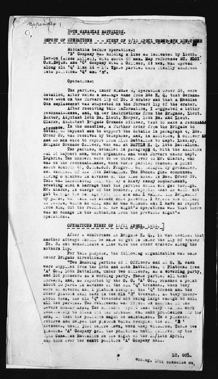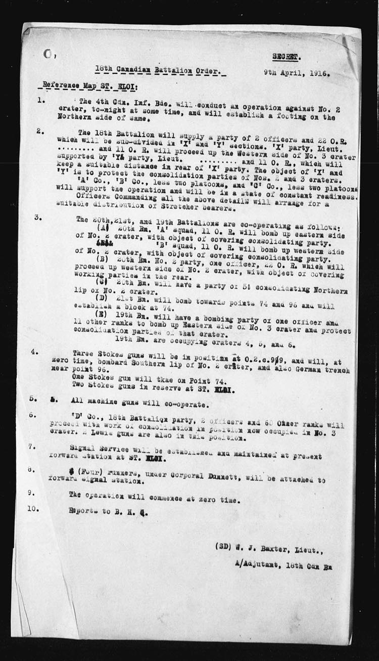 Operation order received from 4th Can. Inf. Bgde. for further operations tonight. LIEUT. BEESON struck off strength from 27.3.16. 1 or Killed in action. 25 o.r.s Wounded.