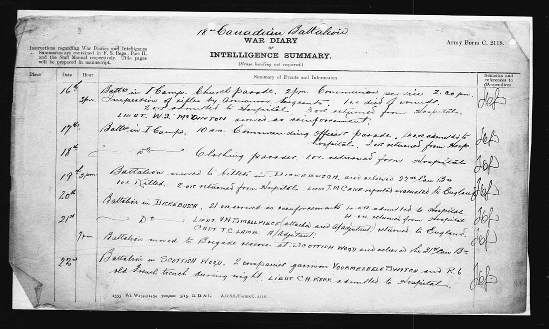 | 19 | 3.00 pm | Battalion moved to billets in DICKEBUSCH and relieved 22nd Can. Bn. 1 o.r. killed. 2 o.r.s returned from Hospital. LIEUT. J.M. CANE reported evacuated to England. | |