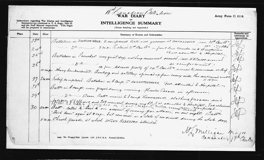 | 29 | Battn. in A camp. 12 noon Battn. moved to I camp RENIGHELST. Clothing parade and fatigue of 8 officers and 350 men out during night. 1 o.r. admitted to Hospital. 8 o.r. returned from Hospital. LT. COL. WIGLE proceeded on leave. MAJOR MILLIGAN assumed command. |