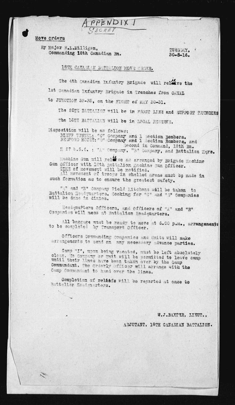 FIELD 30 4th Can. Infy. Bgde. relieved 1st Bgde. See Battn operation orders attached. LIEUT GWYN ret’d from leave. 1 o.r. arr’d as reinforcement. 5 o.r. from Canadian Casualty Base Depot. 3 o.r. ret’d from hospital.