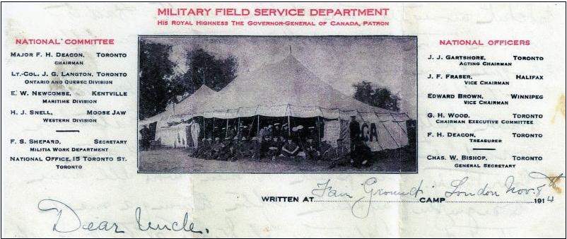 “This soldier business is all right in an armchair before the fire but the real thing is very hard work. I will give you a sample day. I reported for duty according to instructions at seven a.m. yesterday at Barracks. (I) was instructed to take charge of the Stratford Company at the Fairgrounds. I marched them to the divisional stores and drew clothing and full equipment with the exception of rifles for one hundred and sixteen men.”