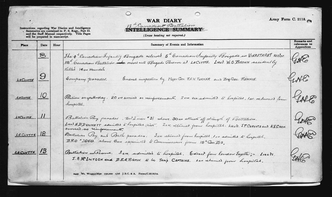 | LACLYTTE | 13 | Battalion in Reserve. 3 o.r.s admitted to hospital. Extract from London Gazette;- LIEUTS. J.A. McINTOSH and D.E.A. RISPIN [to] be Temp. CAPTAINS. 1 o.r. returned from hospital. | |