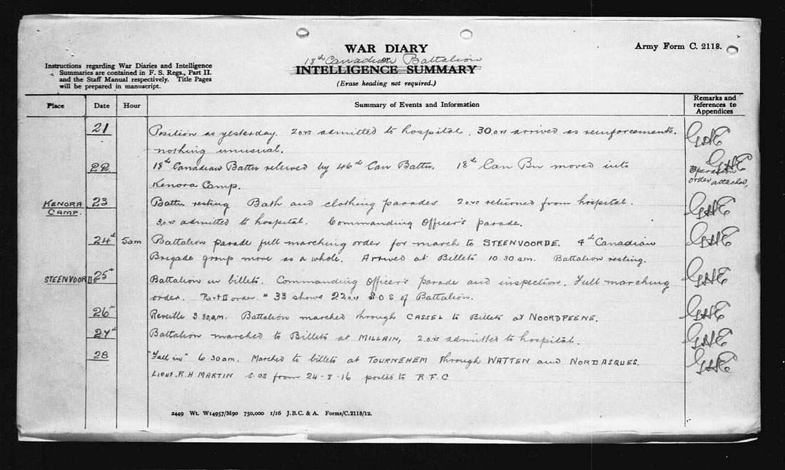 | 24 | 5 AM | Battalion parade full marching order for march to STEENVOORDE. 4th Canadian Brigade group move as a whole. Arrived at Billets 10.30 a.m. Battalion resting. | |
