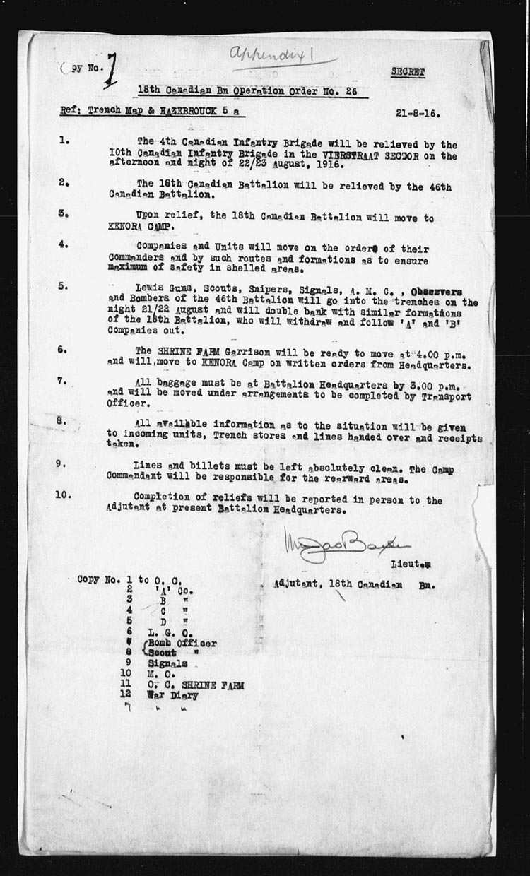 | 22 | 18th Canadian Battn. relieved by 46th Can. Battn. 18th Can. Bn. moved into Kenora Camp. | ||