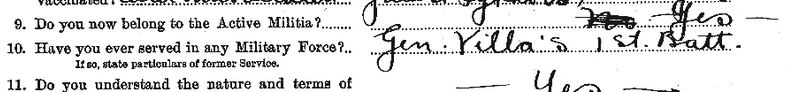 On, then Private, C. John Jackson’s attestation paper under item 10. Have you ever served in any Military Force? The answer is Gen. Villa’s 1st Batt.