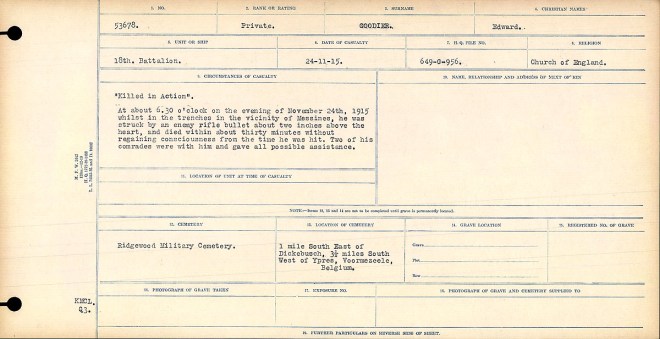 But that day was to have more import for Private Edward Goodier, reg. no. 53678. His “Circumstances of Death” card outlines what happened:
