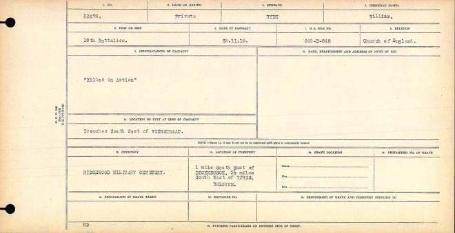 Usually the “Circumstances of Death” cards do not outline as much detail as this. For example, the soldier that died the day before, Private William Ryde reg. no. 53278, was simply described as being “Killed in Action.” The War Diary has nothing more to offer.