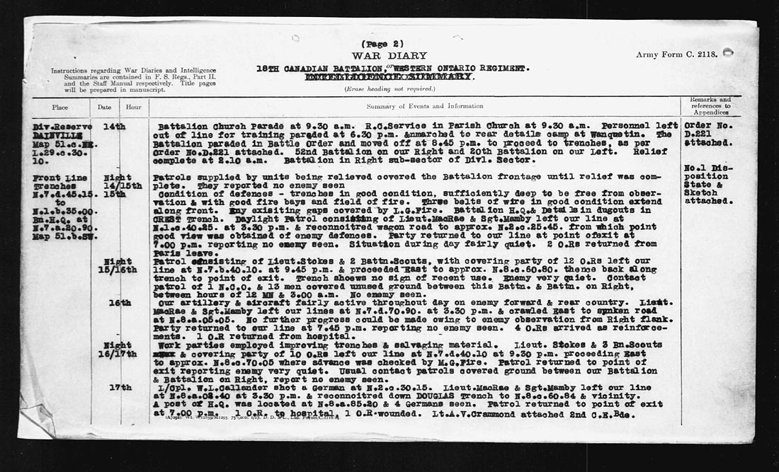 The patrols from the 14th to the 17th involved Battalion scouts under the leadership of Lieutenants MacRae and Stokes, as well as Sergeant Mamby [sic][iii]. No contact or significant casualties seem to have been experienced except Lance-Corporal W.L. Callander, a sniper, is noted for shooting a German soldier on the 17th.