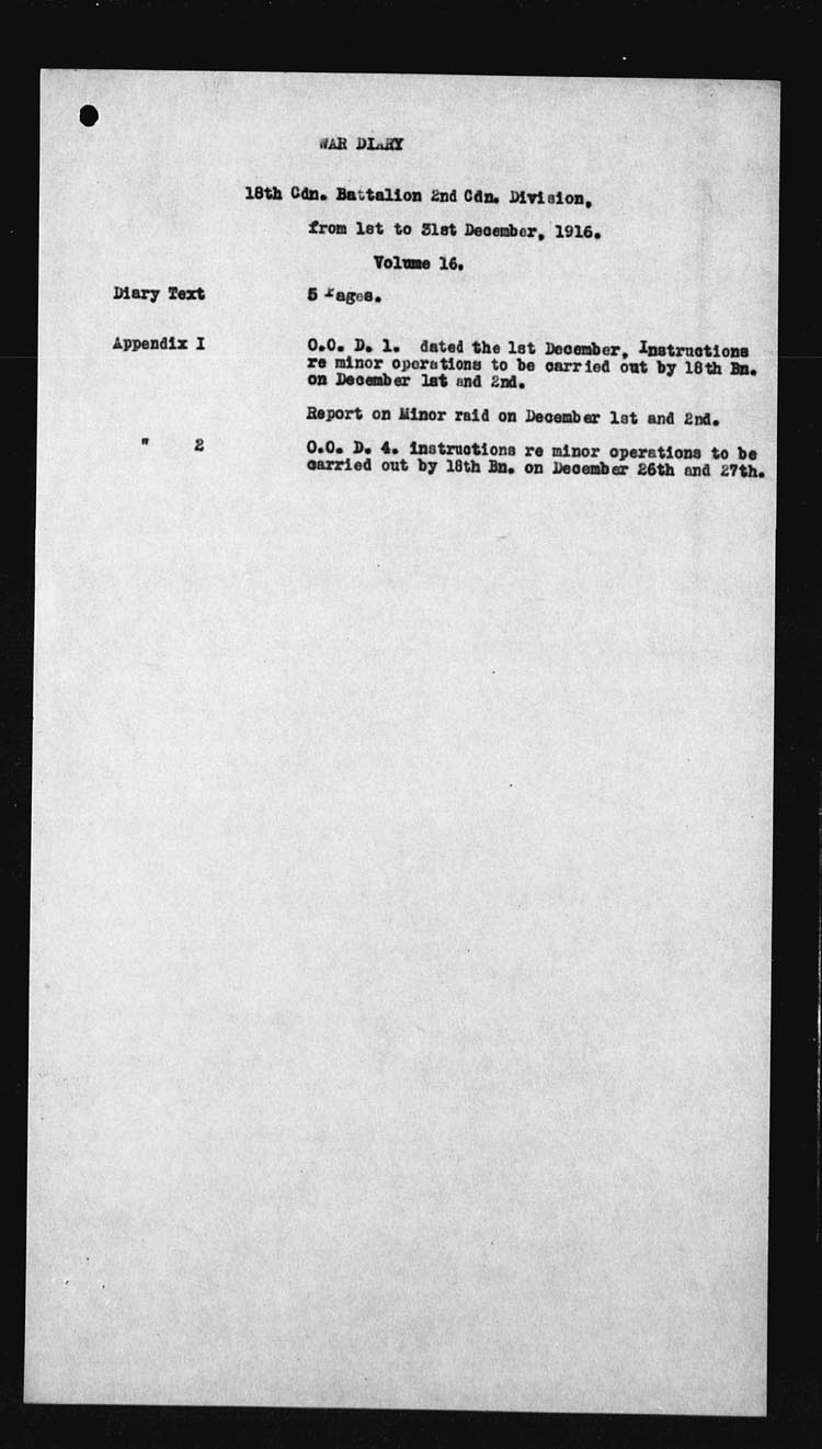 | 16 | 18th Canadian Bn. relieved by 20th Battalion in CALONNE II sector. (MAROC) 18th Bn. moved into Brigade reserve at BULLY. LIEUT. E.R.V. LLOYD and H.D. DUNNETT proceeded on leave. | ||