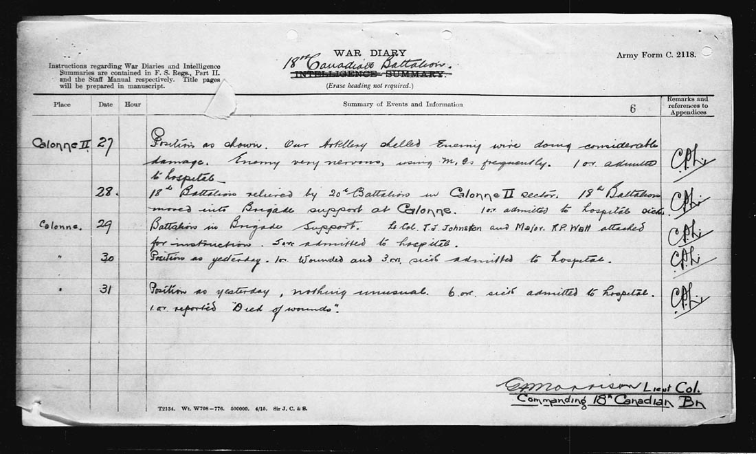 | 22 | 18th Canadian relieved the 20th Canadian Bn. in the CALONNE II sector. Right front A Coy. Right support B coy, Left front C coy, left support D coy. MAJOR G.F. MORRISON from 19th Battalion to be LtCol and command 18th Battalion. Position quiet. | ||