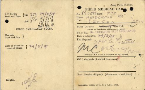 Note: Post amended to reflect the correct location of Private Hardcastle’s wounding resulting in the loss of his leg. Thanks to Patrick Dennis for pointing out the error.