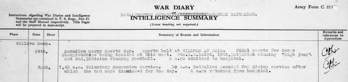 September 30, 1917: Canadian Corps Sports day. Sports held at VILLERS AU BOIS. Final events for Corps Championships being decide at this meet. Pte. D.S. Laird, 18th Battalion winning “High jump” and 2nd Division winning Football. 3 o.rs admitted to hospital.