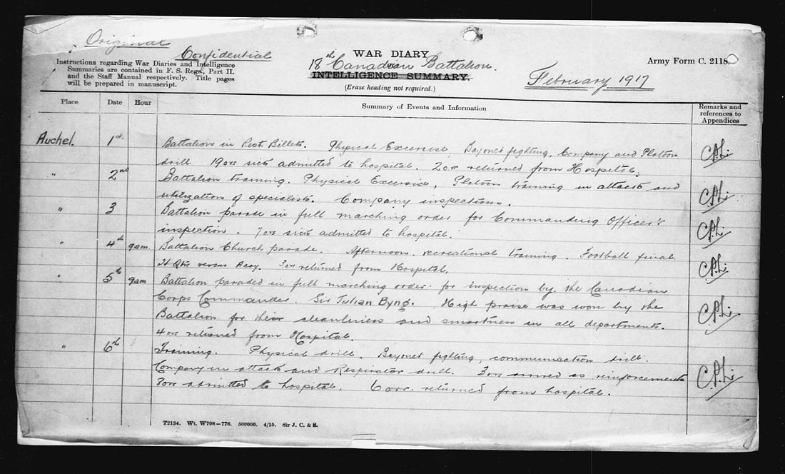 | 17 | Battalion training. Specialized instruction. Sgt. T. DOUGALL 53560 granted commission in 18th Battalion from 16-2-17. | ||