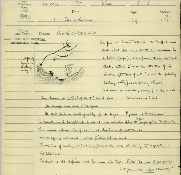 Many of the medical notes in the service records are written out in long-had cursive using grey lead pencil on a grey coloured paper. Invariably these note are nigh unto very difficult to read[i]. But, in the case of Private Blue, we have a fascinating medical note from his wounding during his service. He was wounded in the chest and after being evacuated from the front line his thread of treatment began until his eventual release back to active service in June, 1917. It is fascinating as it overviews the wound, its condition, is legible, and offers a hand-drawn sketch of the wound.
