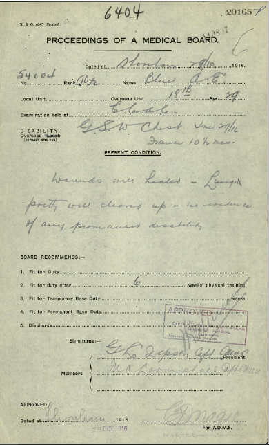 With the wounds healed and his heart now not displaced Private Blue convalesced until October 29, 1916 where he was declared fit for service after 6 weeks training by a C.C.A.C. medical board in Shoreham. The notes read: “Wounds well healed – Lungs pretty much cleaned up – no evidence of any permanent disability.”