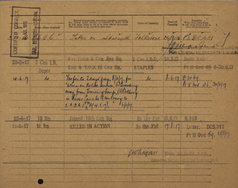 It is here that their respective paths cross. As they both were discharged from England (both soldiers were assigned to the 4th Reserve Battalion in West Sandling though there is no evidence that they were aware of each other) both Private Blue and Graham arrived at the Canadian Infantry Brigade Depot (C.I.B.D.) at Etaples, France on May 28, 1917.