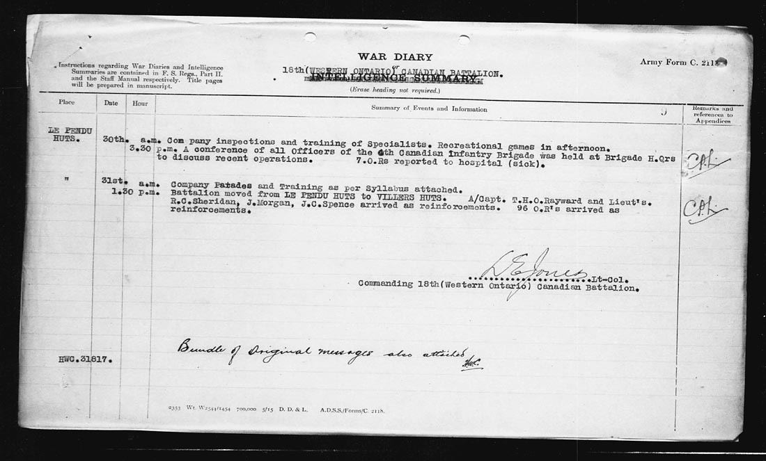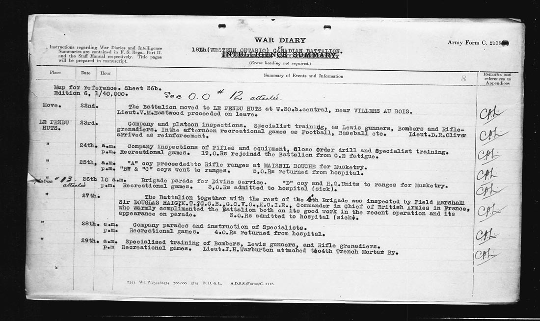 | LE PENDU HUTS | 27 | The Battalion together with the rest of the 4th Brigade was inspected by Field Marshall Sir Douglas Haig K.T., G.C.B., G.C.V.O., K.C.I.E., Commander and Chief of British Armies in France, who warmly complimented the Battalion both on its good work in the recent operation and its appearance on parade.