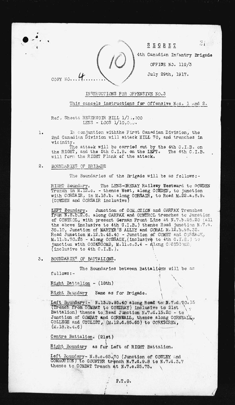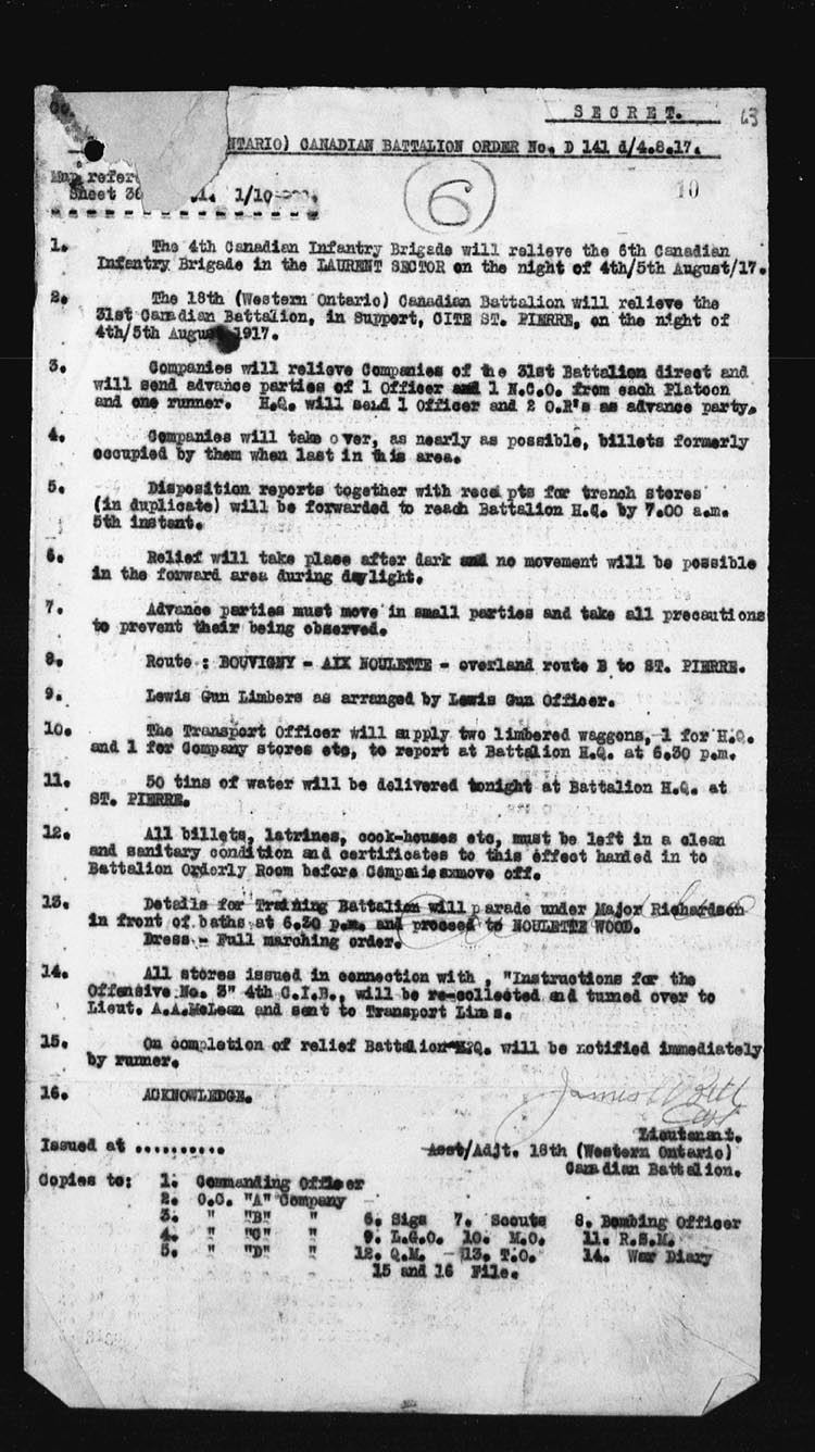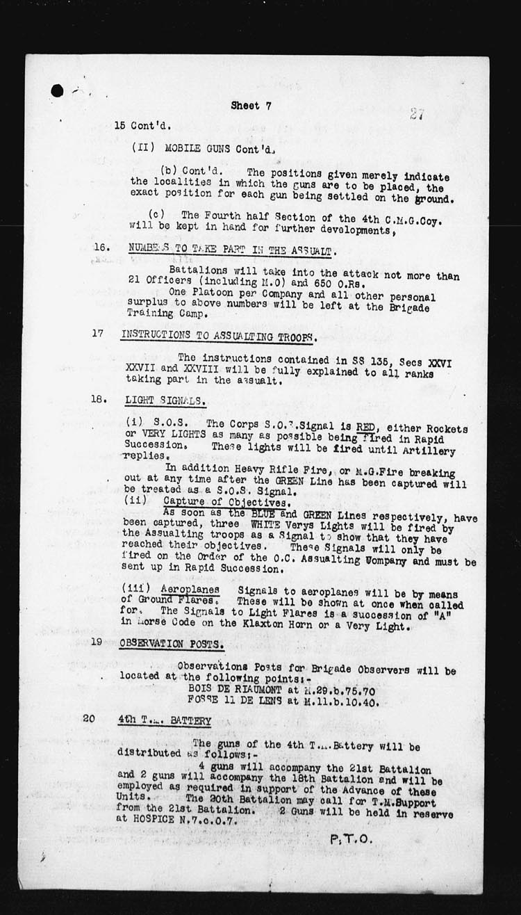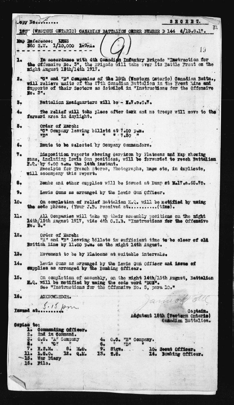 | Night | 18th/19th | The 18th Battalion was relieved by the 50th Canadian Battalion taking over the frontage from the LENS-GRENAY Railway to the LENS-BETHUNE Road, and the 27th Canadian Battalion from LENS-BETHUNE Road to our left boundary.