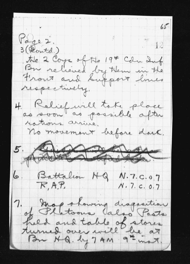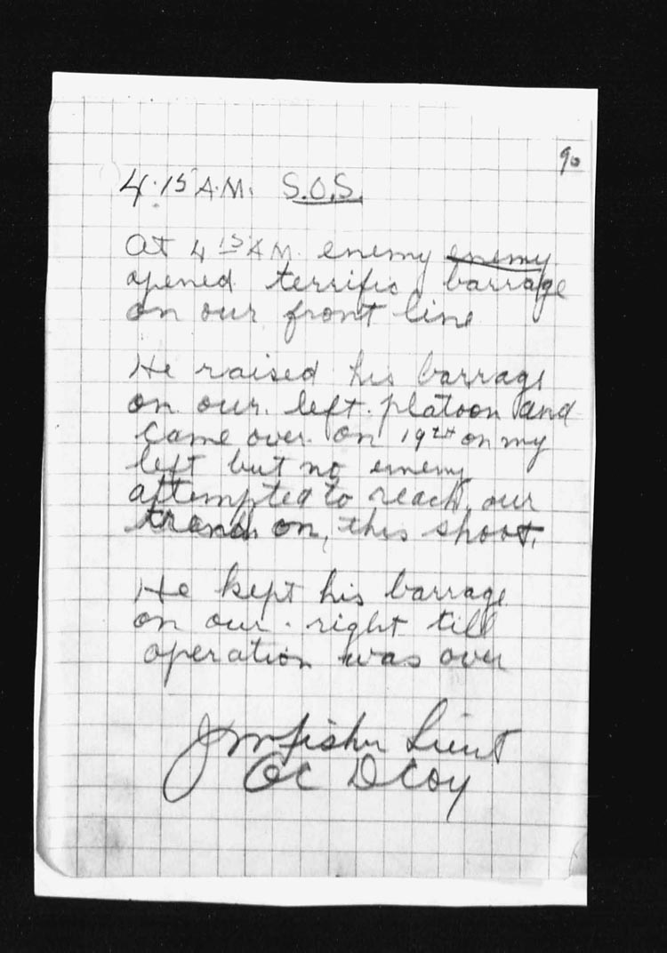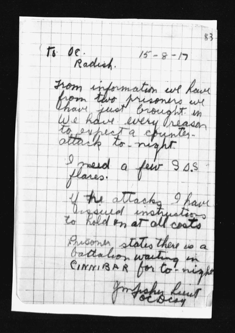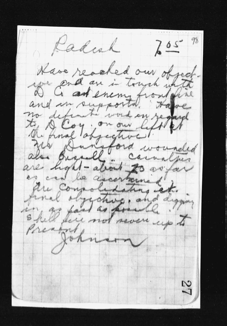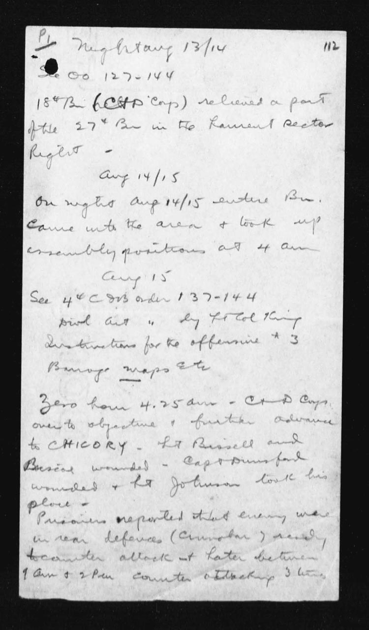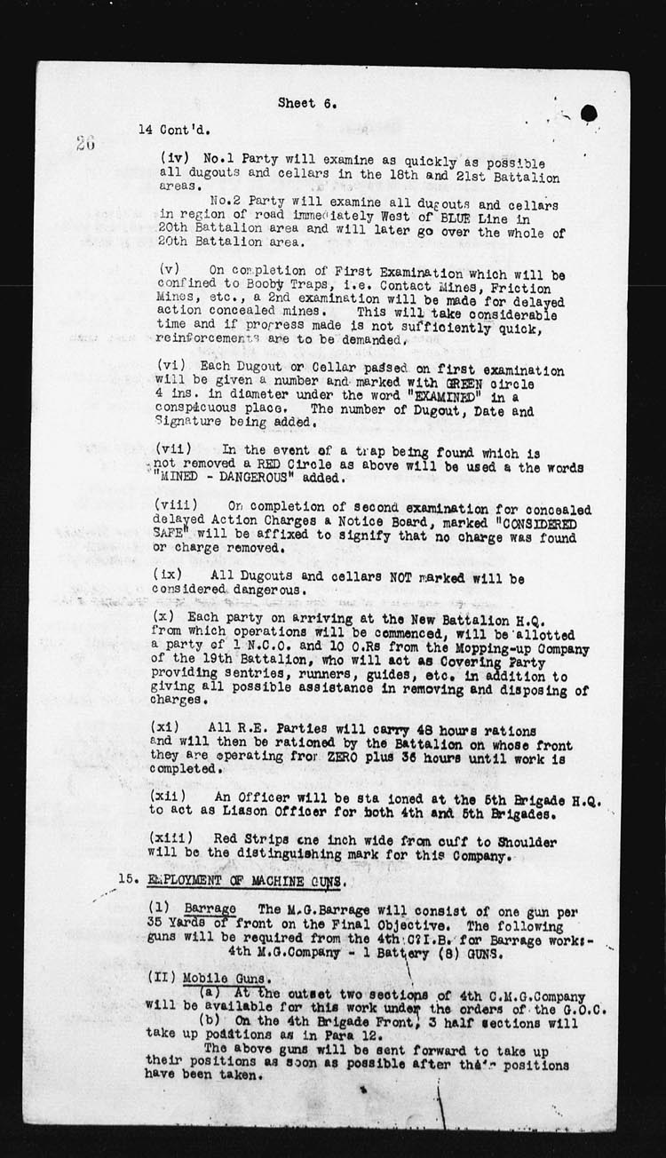 | 15 | As soon as the attack had gone forward, Lieut. T.R. Dougall and some men of the Scout Section started forward to make a reconnaissance patrol and to exploit success, they were held up for an hour by an enemy plane firing on them from immediately overhead. When the patrol reached the captured enemy position, it went forward approximately 300 yds from our newly won position.