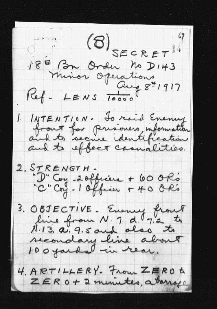 The whole raiding party was under the command of Lieut-Col. L.E. Jones, O.C. 18th Canadian Battalion. The frontage raided by the 18th Battalion was the German front line from N.13.b.1.4 to N.7.d.70.15.
