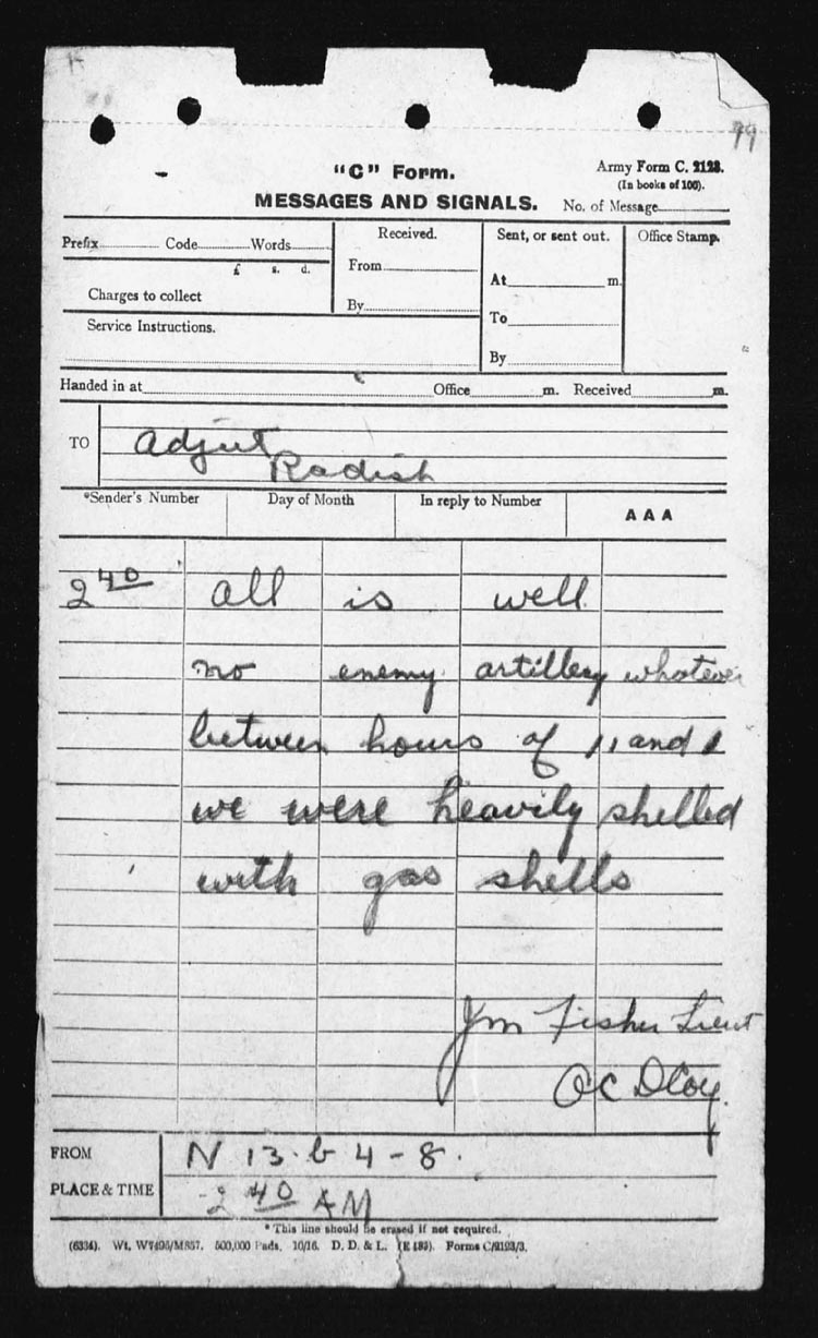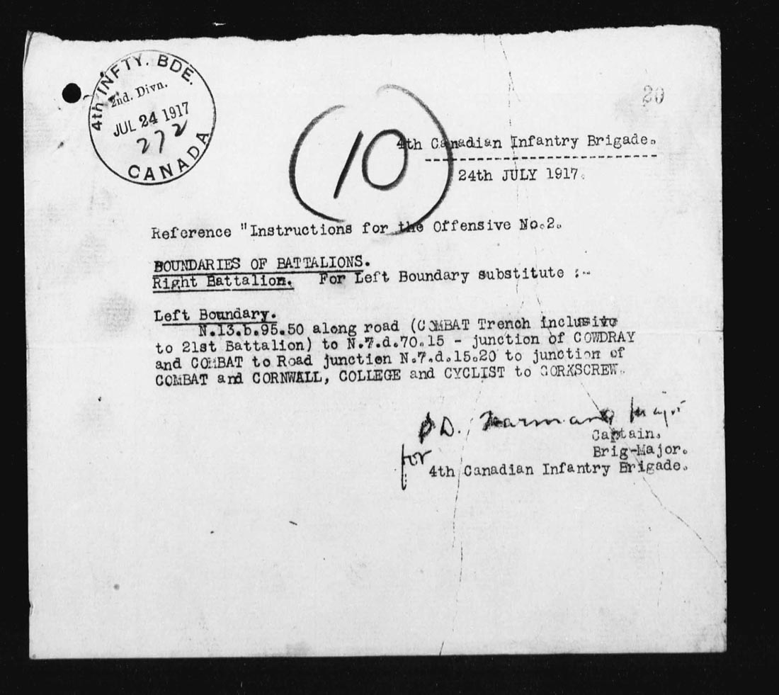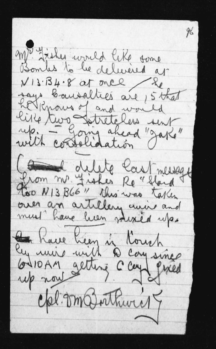 At 5 a.m. Capt. J.S. Bell, Adjt, went forward and succeeded in re-organizing the parties and established posts at N.13.c.85.80 – N.13.c.95.90 – N.13.central and N.13.b.4.1. and AMULET TRENCH was found to be untenable.
