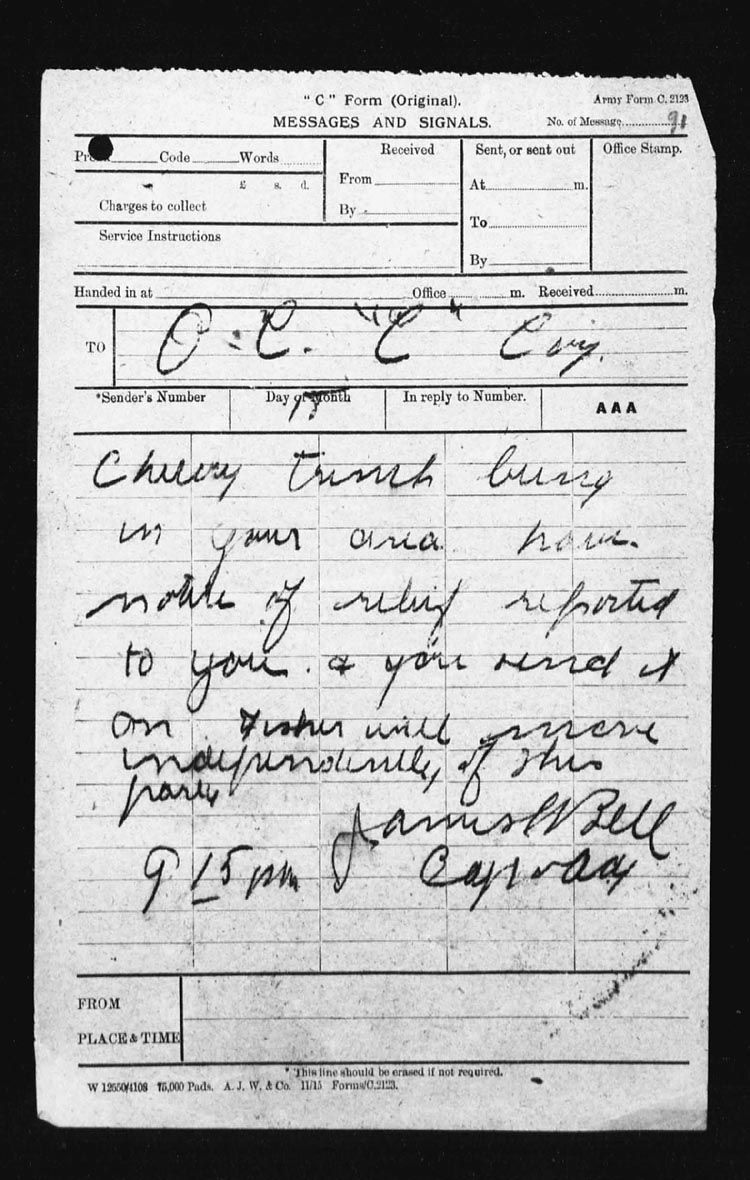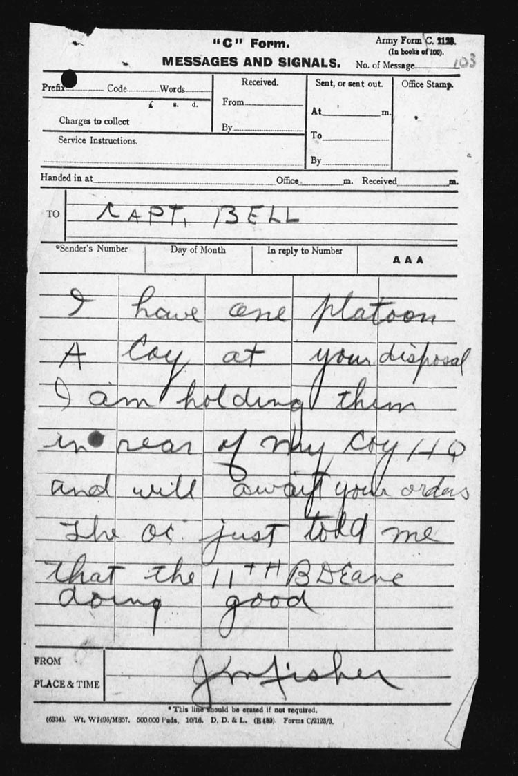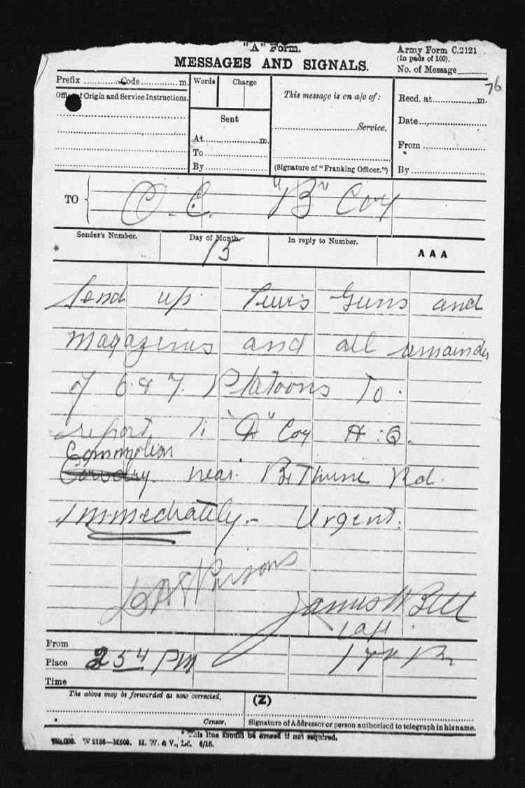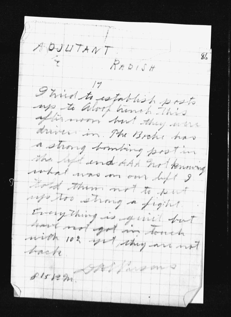 At 5 a.m. Capt. J.S. Bell, Adjt, went forward and succeeded in re-organizing the parties and established posts at N.13.c.85.80 – N.13.c.95.90 – N.13.central and N.13.b.4.1. and AMULET TRENCH was found to be untenable.