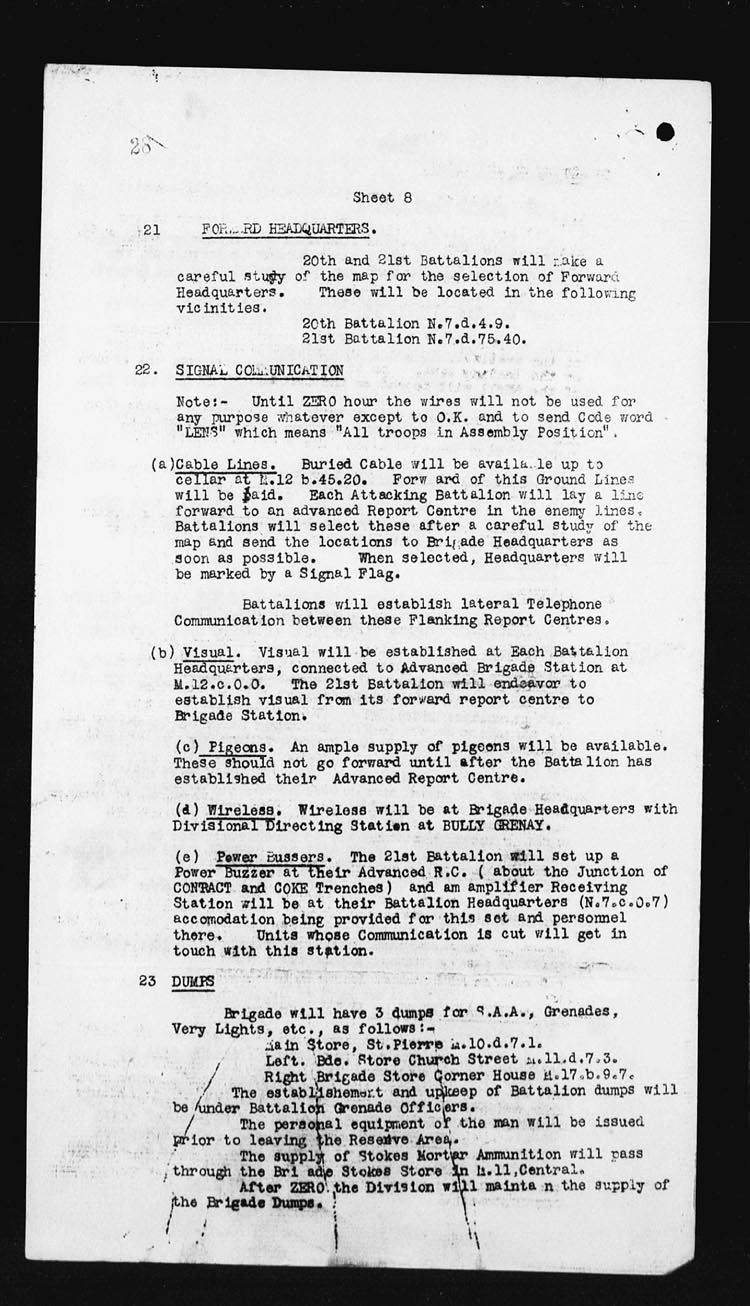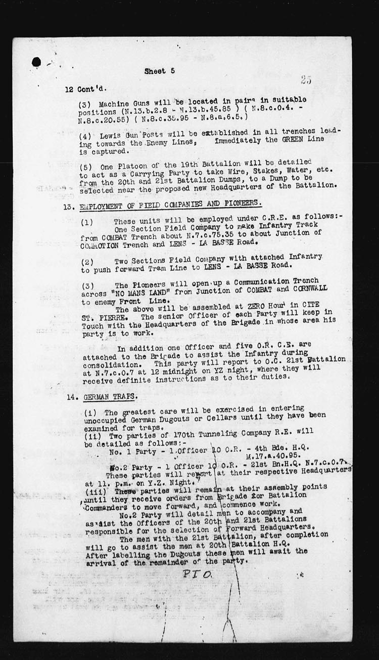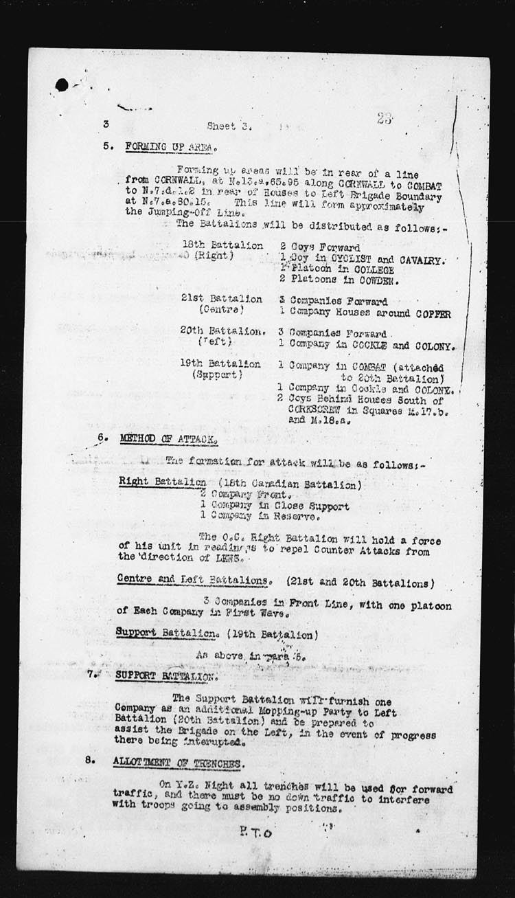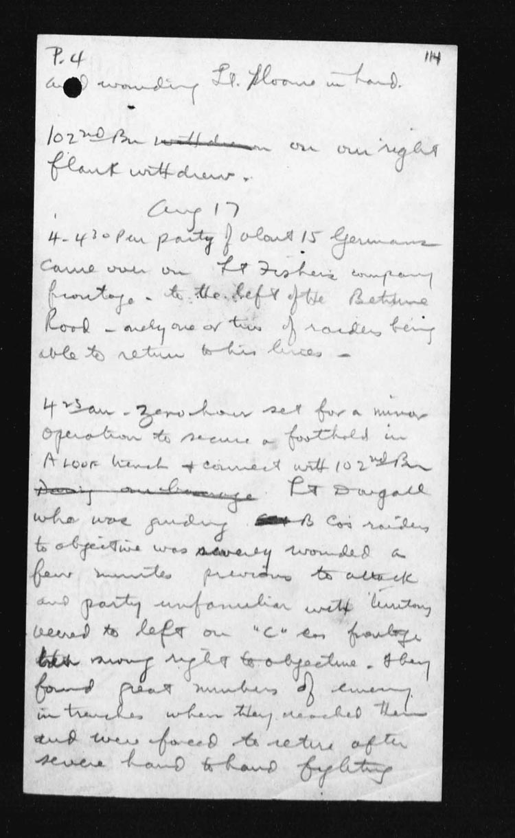 | 17 | In the early hours of the morning the assaulting platoons were taken forward and it was while giving assistance to the Officers in the placing of their men, Lieut. DOUGALL was mortally wounded by an enemy 5.9 shell. However the attack went forward at the proper time, and occupied COTTON TRENCH from N.13.c.95.90 – N.13.central and N.13.b.4.1 but owing to heavy shell fire and the withdrawal of troops on our right, a certain amount of disorganization followed.