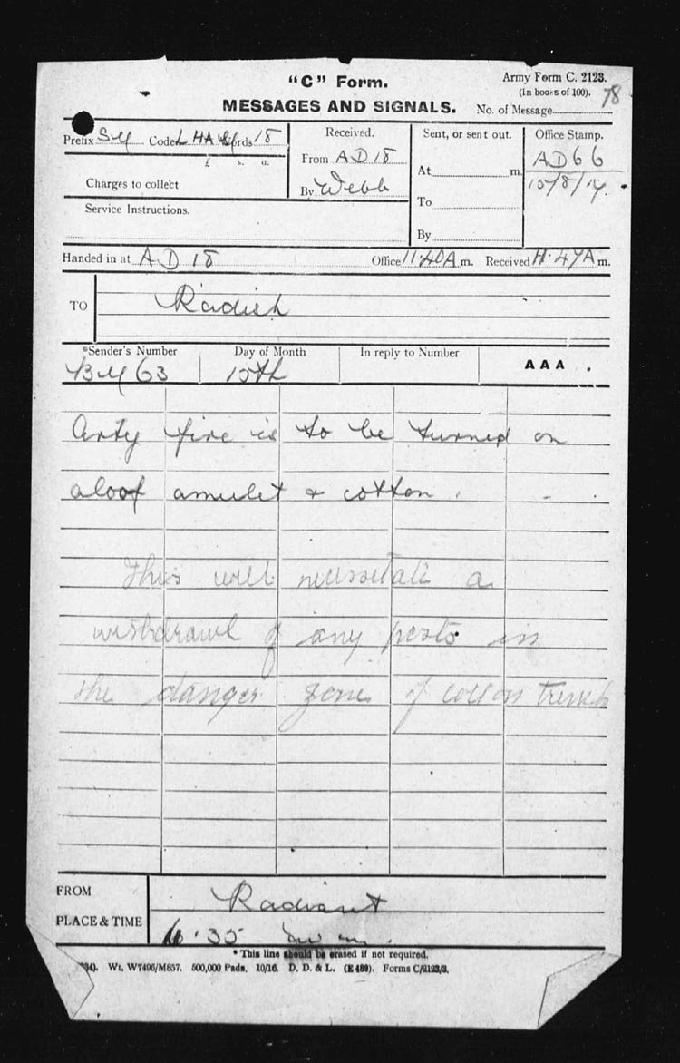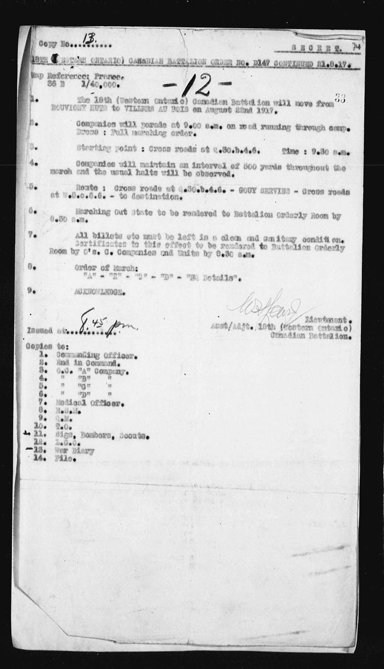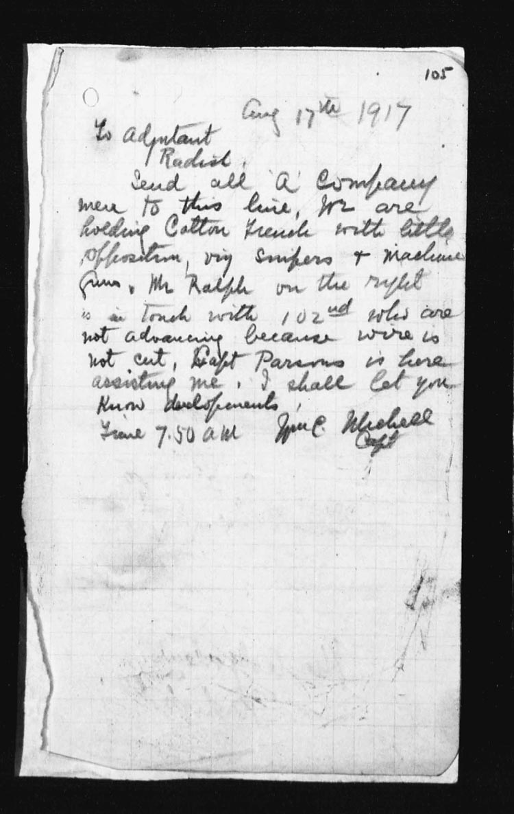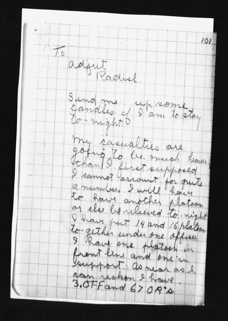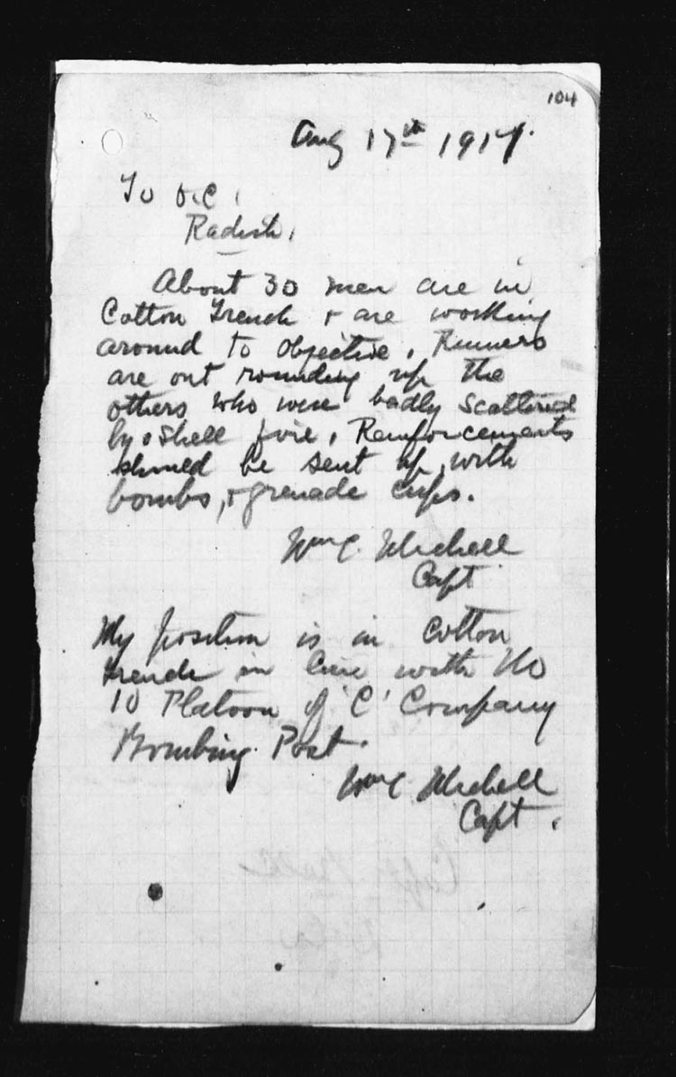 | 17 | In the early hours of the morning the assaulting platoons were taken forward and it was while giving assistance to the Officers in the placing of their men, Lieut. DOUGALL was mortally wounded by an enemy 5.9 shell. However the attack went forward at the proper time, and occupied COTTON TRENCH from N.13.c.95.90 – N.13.central and N.13.b.4.1 but owing to heavy shell fire and the withdrawal of troops on our right, a certain amount of disorganization followed.