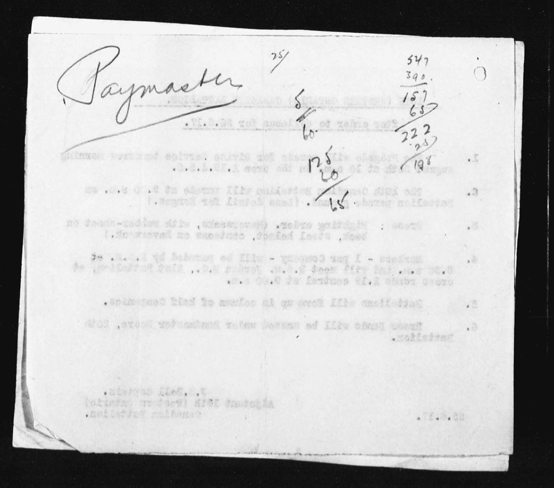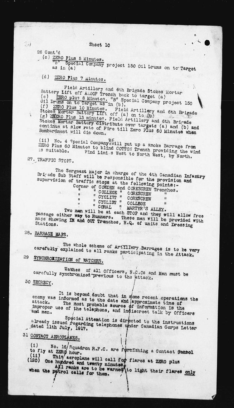 The Battalion furnished carrying parties of 350 men for carrying for Trench Mortar Batteries to their gun positions. Casualties numbering 1 o.r. killed[i] and 3 o.rs Wounded. | |