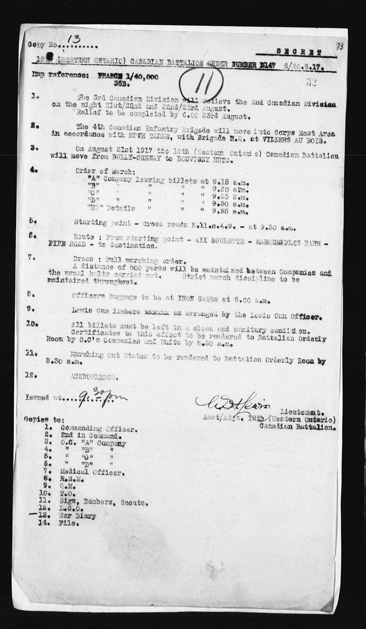 See O.O. #11 attached | 21 | 9.30 | The Battalion left BULLY-GRENAY at 9.30 a.m. and proceeded to BOUVIGNY HUTS going in Corps Reserve. On the road “D”coy sustained 52 casualties, 23 of which were fatal, by the bursting of an enemy shell (high velocity). This bringing our casualties to approximately 220 during the tour.
