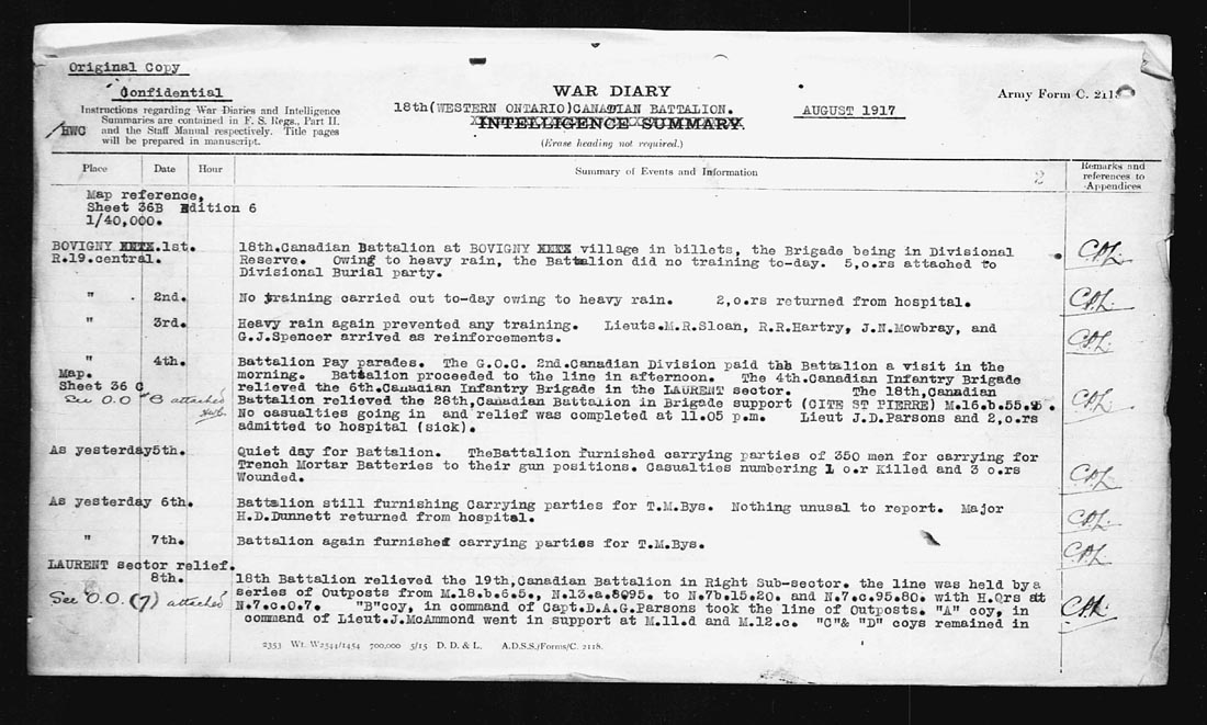 | BOVIGNY 1st. R.19.central. | 3 | Heavy rain again prevented any training. Lieuts. M.R. Sloan, R.R. Hartry, J.N. Mowbray, and G.J. Spencer arrived as reinforcements. | |