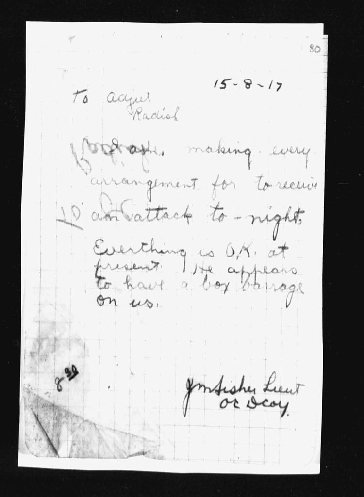| 18 | At 12.00 midnight 17th-18th, a heavy enemy barrage opened on the whole Brigade front. Our Artillery replied immediately to an S.O.S. call from our left. No enemy attack was delivered on our front, although some grenades were thrown.