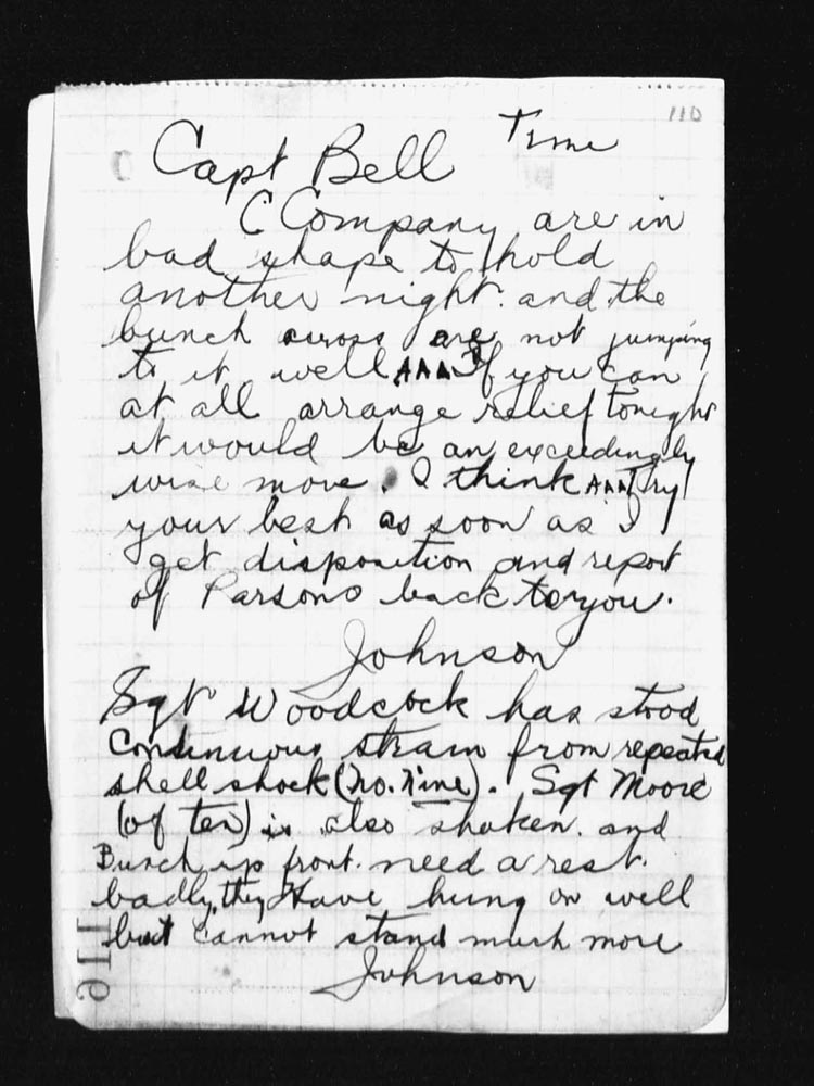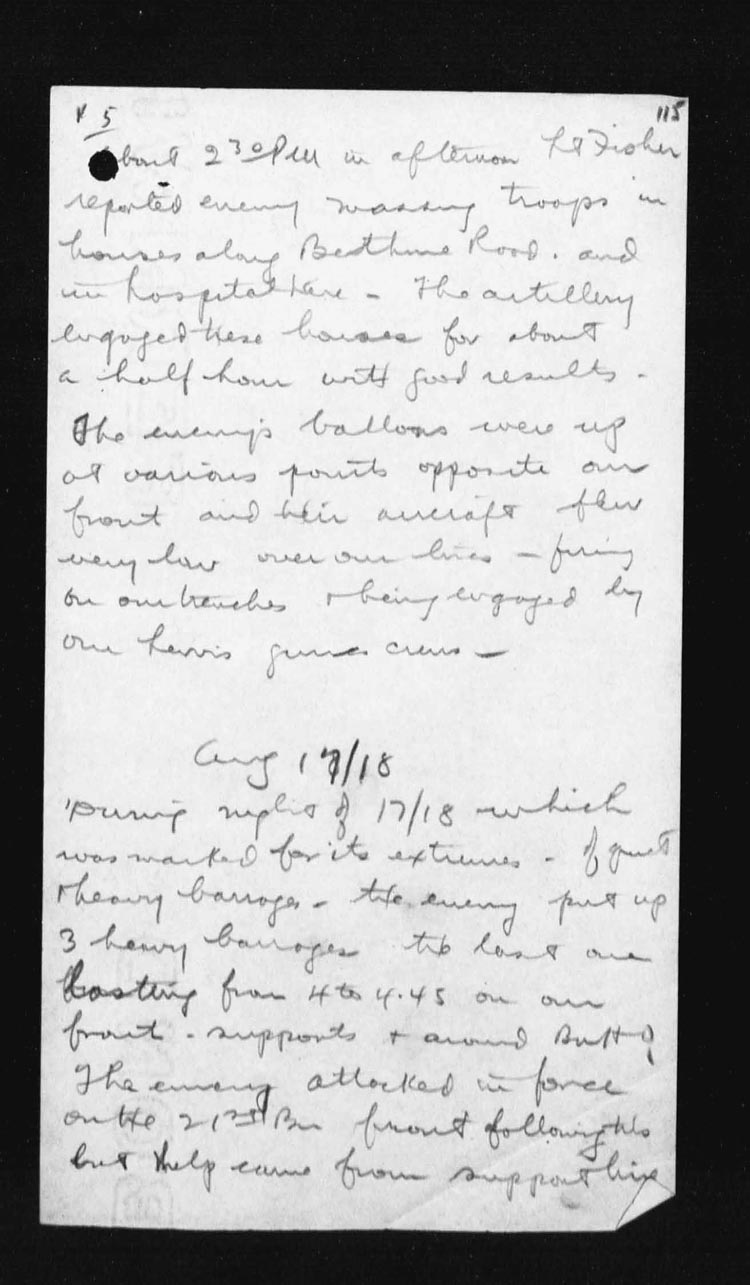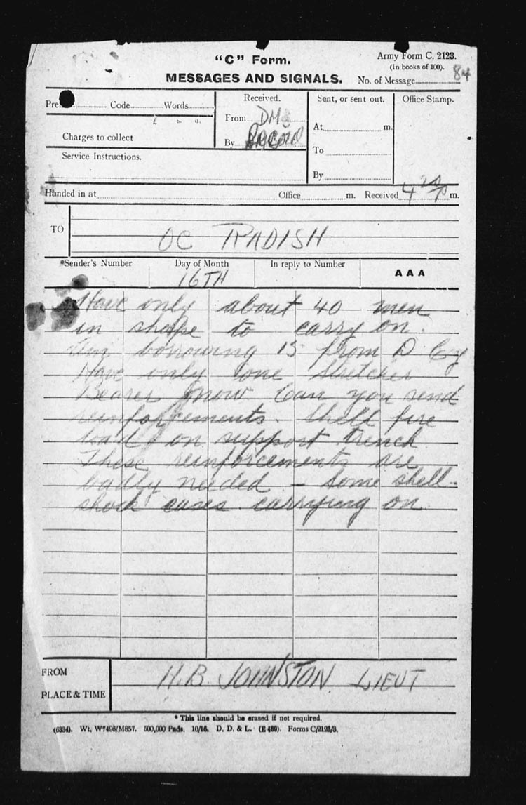 | Night of | 15th | Upon Captain Dunsford being wounded, Lieut. H.B. Johnson took over command of the company. At night there were not attacks or counter-attacks, but enemy artillery was exceptionally heavy on all parts of our sector. | |