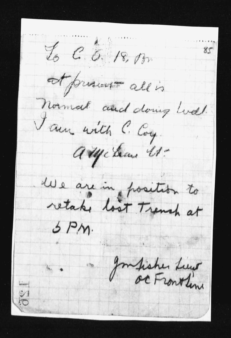 Three platoons of the support Coys were sent up to reinforce “D” Coy. Lieut. J.M. Fisher with great judgement and coolness, prepared his counter attack in conjunction with the 21st Battalion.