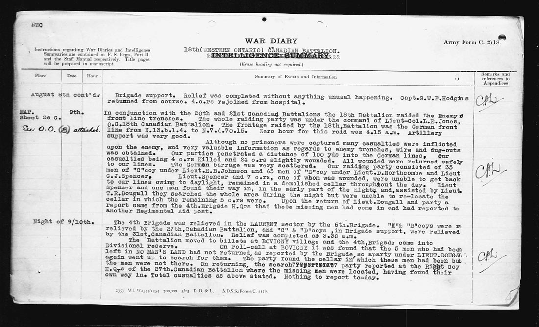 | MAP Sheet 36 C. See O.O. (8) attached | 9 | In conjunction with the 20th and 21st Canadian Battalions the 18th Battalion raided the Enemy front line trenches.